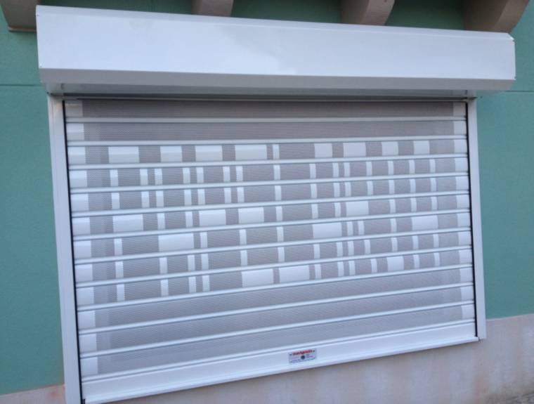 As nossas grades de enrolar microperfuradas com nome são constituídas por perfis articuláveis em chapa de 110mm x 0.8mm com multifuros de 4mm, que deslizam na vertical em calhas de forma U fixas lateralmente ao vão através de buchas e parafusos, auxiliados por molas de aço no topo.